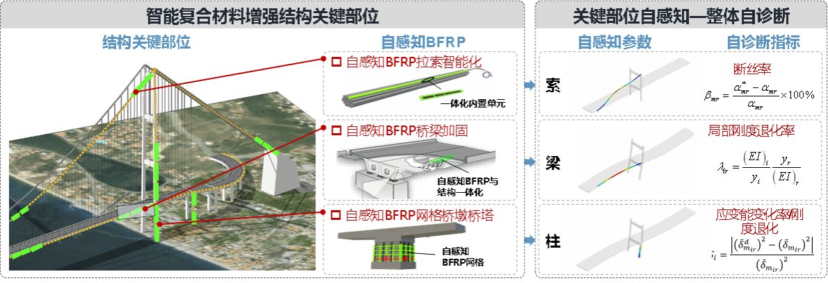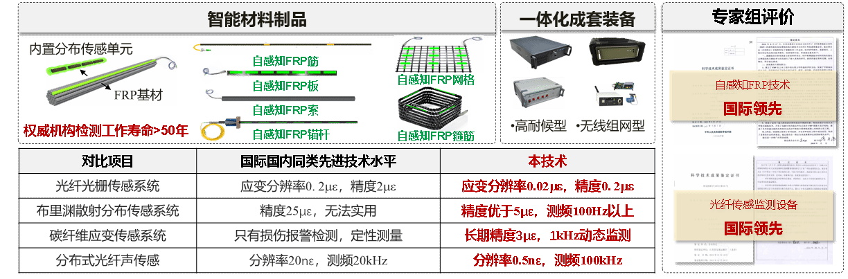 成果简介:针对传统结构监测方法效率低、主观性强、难以发现内部早期损伤等问题。采用在复合基体中嵌入光纤与碳纤传感元件的设计思路,使材料同时具备承载与感知双重功能。研发了玄武岩纤维智能复合材料及配套解调仪,构建了一专多能传感、早期损伤分析与多层次评估预测相结合的智能监测技术体系。可实现应力、应变、位移、转角等多参量高精度同步监测。其中,光纤光栅传感器应变分辨率达0.02με、精度0.2με、量程30000με,可实现纳应变级微振动检测;布里渊散射传感精度优于5με,采样频率超过100Hz;分布式光纤声传感的噪声水平为2pε/√Hz@100Hz,应变分辨率0.5nε,可实现100kHz的动态监测;碳纤维传感元件应变精度3με,改性后首次实现稳定线性响应。配套解调仪集成数据采集、智能处理与健康评估模块,具备温度自补偿与误差自校准机制,系统稳定性显著提高。与国内外同类产品相比,该体系的综合性能提升30%以上。
