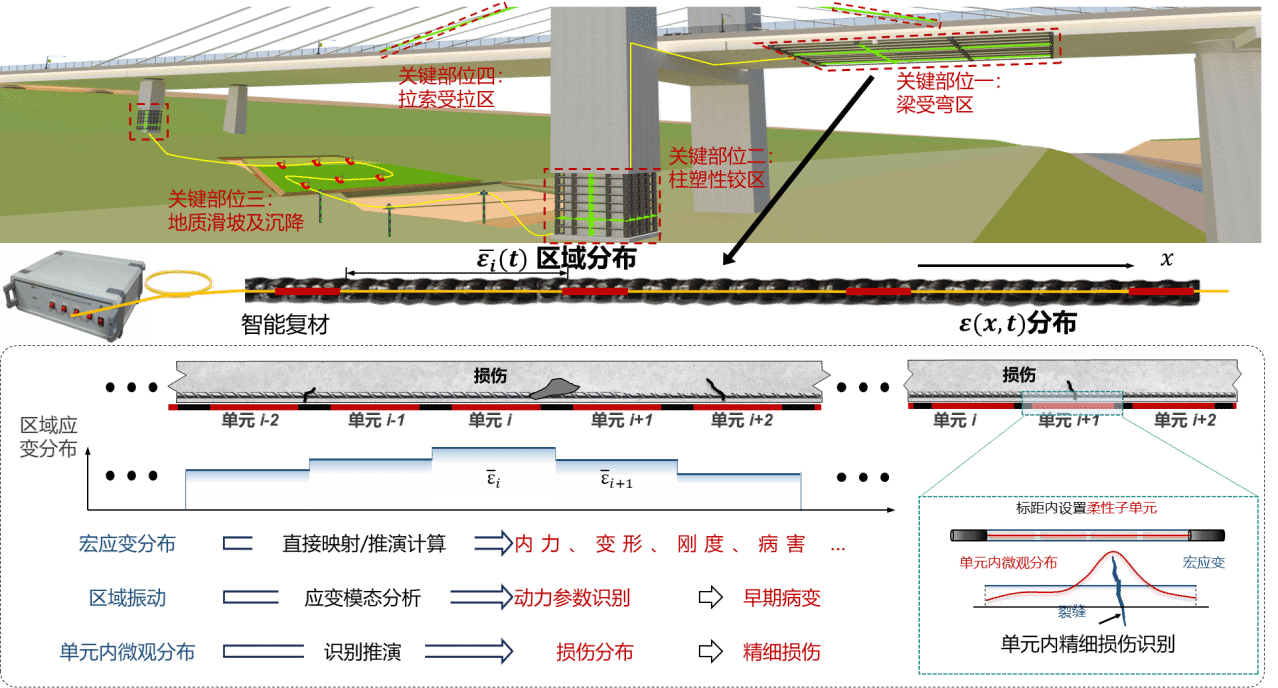 应用前景:1、桥梁工程:可对应力、应变、位移、荷载、温湿度等动静态指标进行长期监测,实现缆索断丝、钢筋腐蚀、桩基冲刷等早期病害识别与寿命预测;在平潭海峡大桥实现厘米级冲刷监测,在东吾洋特大桥实现冲刷损伤精准定位与定量分析,在张靖皋大桥实现断丝早期监测与定量评估。2、隧道工程:可感知不均匀沉降与接缝不连续变形,在杭州庆春路过江隧道中监测精度达0.1mm,实现施工期至运营期的连续监测。3、轨道交通:可对轨道基础内部微振动进行长期稳定监测,结合振动应变时程分析,可识别沉降、裂缝及固有频率变化,实现列车运行状态与轨道健康的精准感知。4、储罐工程:在揭阳原油储罐中实现罐体与地基协同变形监测,应变精度±1με、沉降精度1mm,保障大型储罐长期运行安全。5、地质灾害防控:监测深度达480m,可实现地基多点分层沉降与边坡三维变形监测;在中油储备库边坡中布设288个测点,变形识别精度优于1cm,为滑坡与沉降灾害提供早期预警。6、建筑结构:在江苏大剧院项目中,利用智能复合材料对钢-混节点进行监测,成功识别斜钢柱与混凝土梁界面应变分布,验证节点受力无滑移。