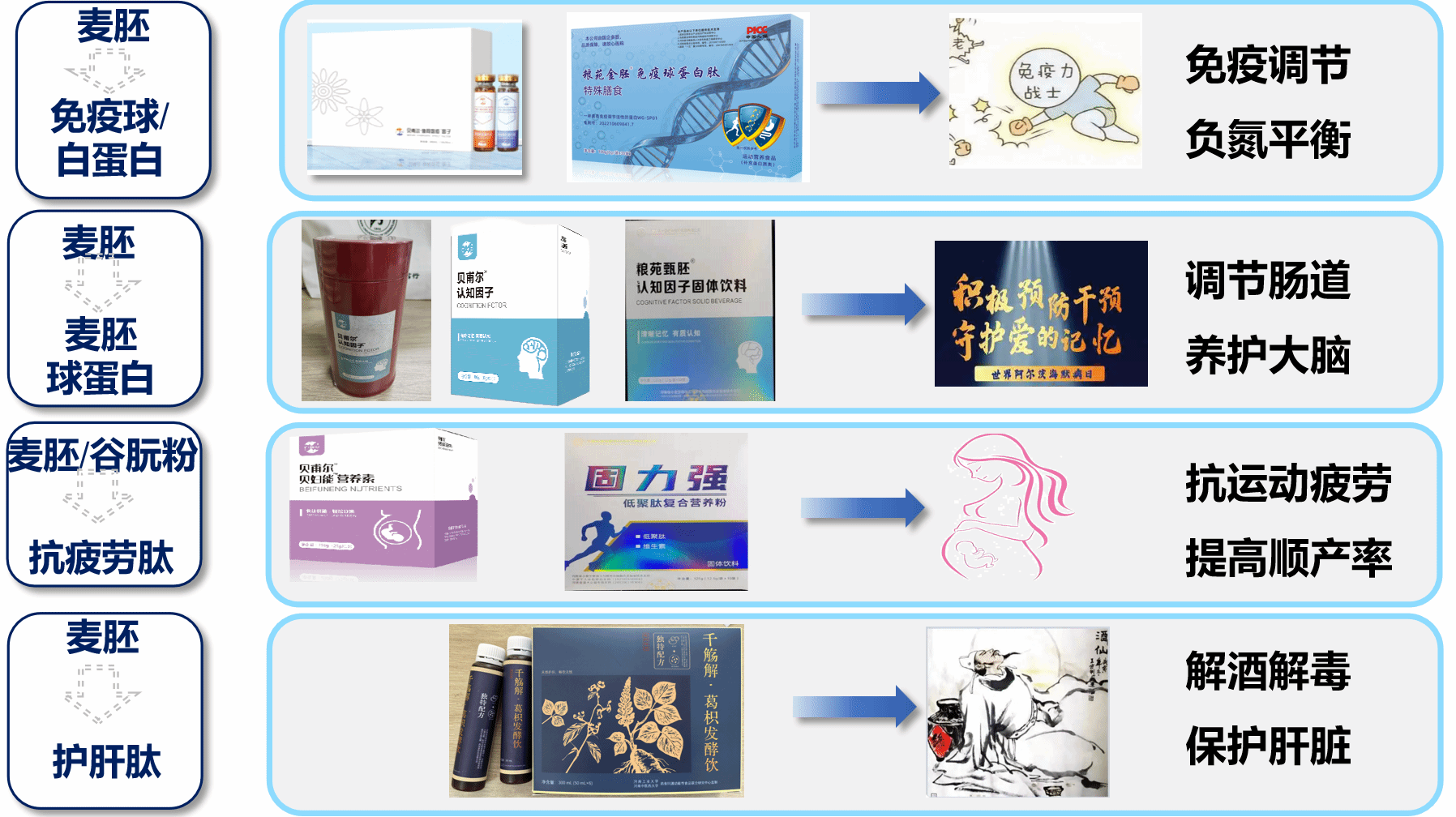 应用前景:1、免疫调节:麦胚免疫球蛋白/白蛋白,可广泛应用于术后、癌症放化疗等免疫力低下人群;2、预防认知障碍:麦胚认知因子,可基于肠-脑轴预防阿尔兹海默症的发生,助力主动健康老龄化;3、抗疲劳:麦胚白蛋白及抗疲劳肽,可作为运动群体、孕产妇等的能量补充剂;4、护肝修复:小麦源高F值低聚肽、葛枳酵素饮,可有效缓解酒精性肝损伤等。