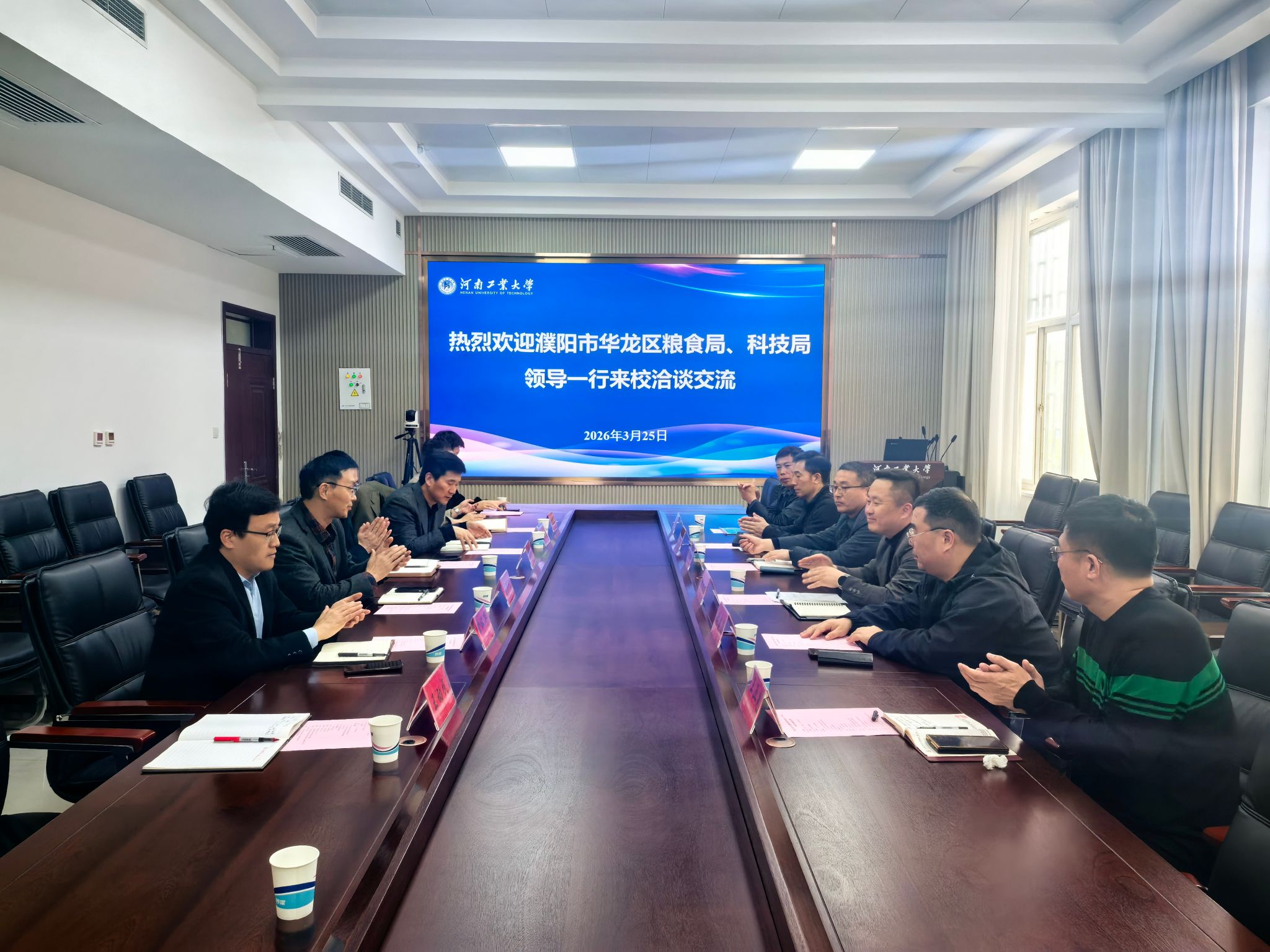 随后,双方围绕绿色储粮技术应用、粮食文化资源挖掘、校地产学研深度融合等议题进行了深入交流。双方一致认为,华龙区具备良好的粮食产业基础与应用场景,河南工业大学在储粮技术、粮油加工、粮食文化传播等领域拥有丰富科研积累,通过校地协同创新,能够实现资源共享、优势互补。